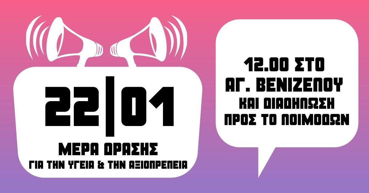 Επίσης το Σάββατο 22/1, πανελλαδική ημέρα δράσης για την υγεία και την αξιοπρέπεια, το Κοινωνικό Ιατρείο Αλληλεγγύης μαζί με συλλογικότητες και κινήσεις της πόλης, καλεί όλους και όλες σε συγκέντρωση και πορεία προς το "Λοιμωδών" στις 12 το μεσημέρι στο άγαλμα του Βενιζέλου.